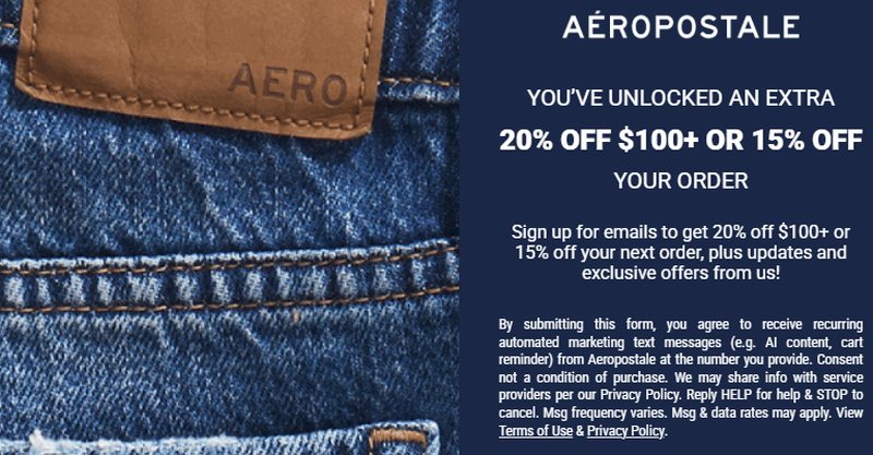 Sign up for Aero Texts, which is the Aeropostale text message system, as well as Aeropostale emails, to make sure you're getting exclusive Aeropostale 20% off text discounts and deals. Aero Texts is the best way to get the most up-to-date information on sales and Aeropostale 20% off text.