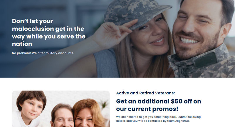 Yes. Active duty and retired veterans are eligible for an additional $50 military discount. This is one of the few discounts that ALIGNERCO allows to be added on top of existing site-wide sales.