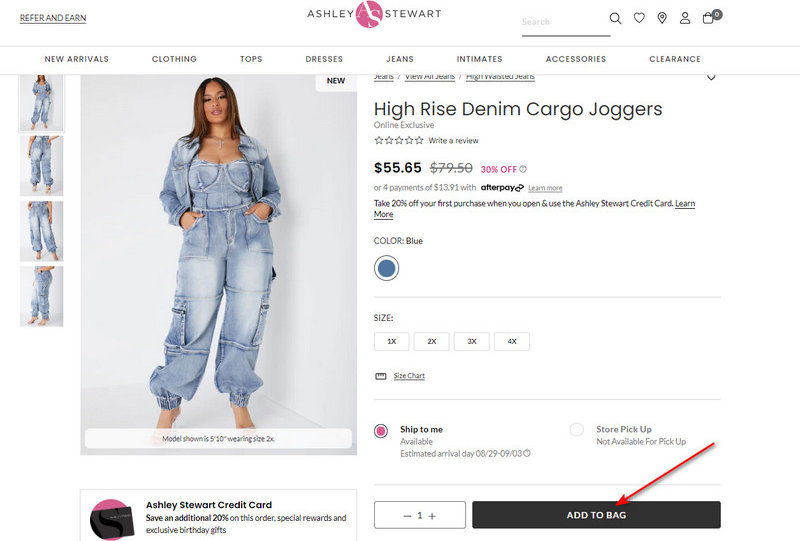 Navigate to the official Ashley Stewart website and add desired plus-size clothing items, such as Ashley Stewart jeans or tops, to your virtual shopping cart.