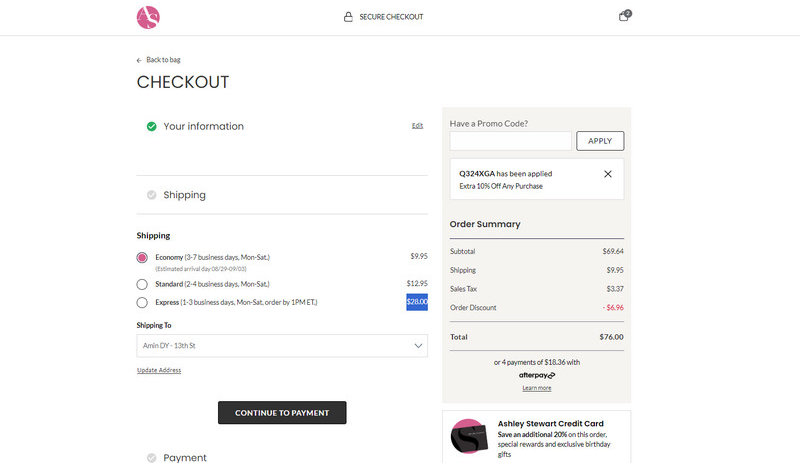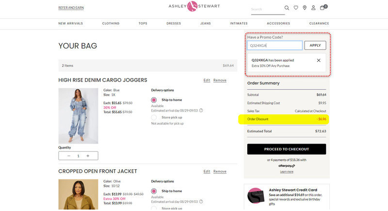 Place your order online, apply your Ashley Stewart promo code, and select the option to pick up the order at a local Ashley Stewart location near you. This is an easy way to bypass the $9.95 to $12.95 shipping fees.