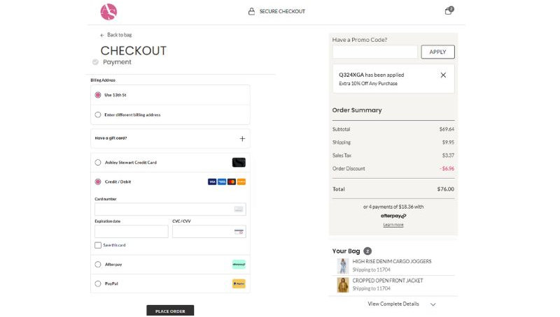 Select a payment option (Ashley Stewart Credit Card, Credit/Debit Card, Afterpay, or PayPal) to complete your discounted purchase.