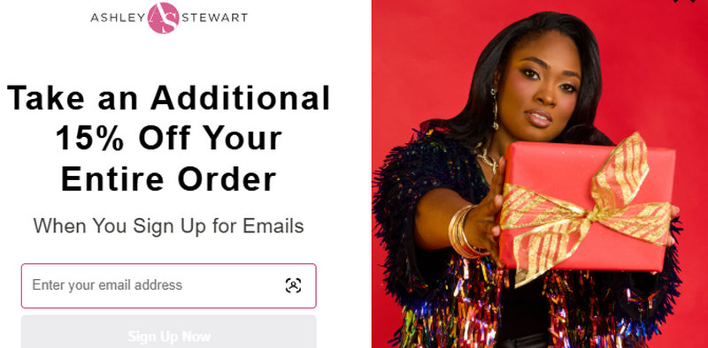 The Ashley Stewart 15 off coupon code is for new customers only who the first time join Ashley Stewart Newsletter. This 15% off coupon code is valid for the first full priced order.