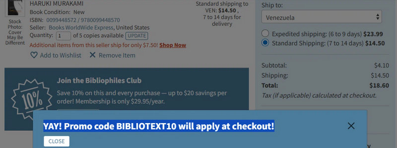 The Bibliophiles Club is a membership ($19.95/ year) that gives you an automatic Biblio discount code for 10% off every purchase.