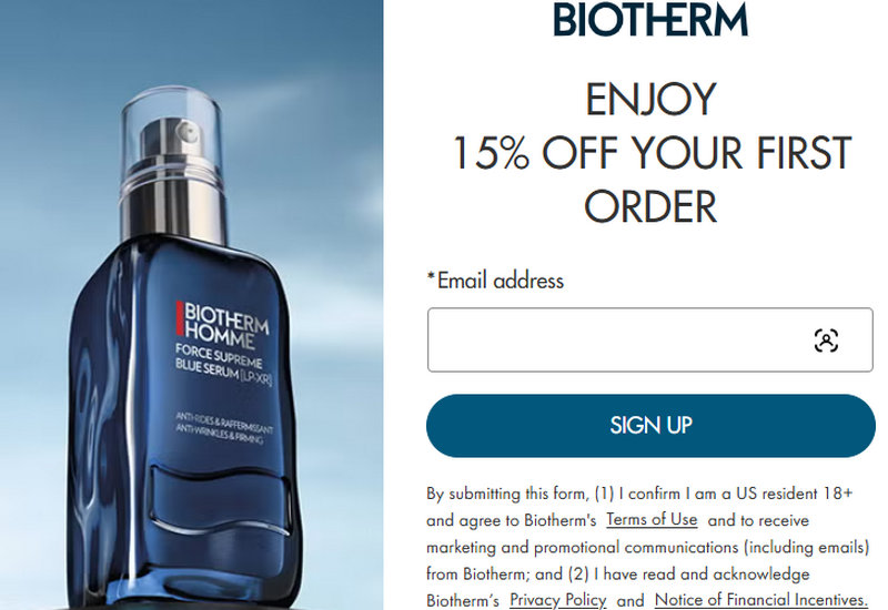 The best first order discount is the 15% off code obtained by subscribing to the official Biotherm newsletter. An occasional 20% off code may appear, but 15% is the most reliably available offer.