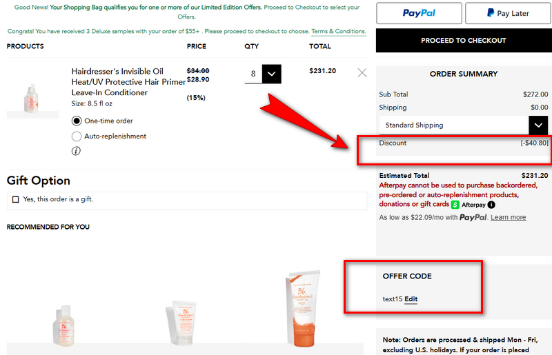 To demonstrate, the text15 code was applied to a first-time order containing the Hairdresser’s Invisible Oil Hydrating Shampoo and the Bond-Building Repair Hair Styling Cream.