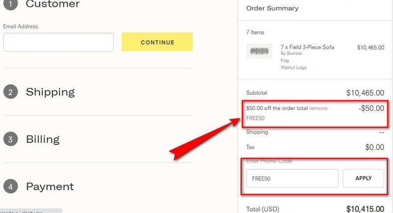 Flat savings codes like SAVE30 or W50 are often best for smaller or mid-sized carts, while percent-off codes shine on bigger orders. On a $250 cart, a $50 off coupon saves more than 15% off ($37.50). On a $1,800 sectional, a Burrow discount code 20% OFF saves $360, which is far better than a flat $50. When in doubt, try both types at checkout and pick the lower total.