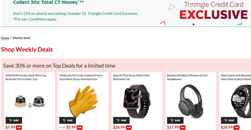 Triangle Bonus Days | Spend $200, get $30–$40 in Bonus CT Money | Auto care kits, small appliances, patio, camping gear | 2-day online windows, several times per year |