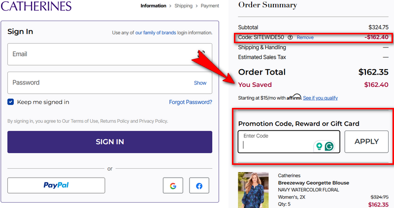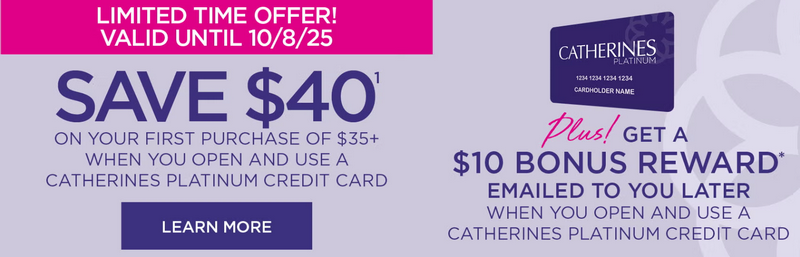 Free standard shipping applies automatically on orders of $75+ when using the Catherines Platinum Card, even without entering a separate shipping code. This offer is ongoing and consistently honored for cardholders.
