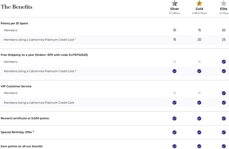 Catherines free shipping Reward does not apply to gift cards, International orders, or prior purchases.