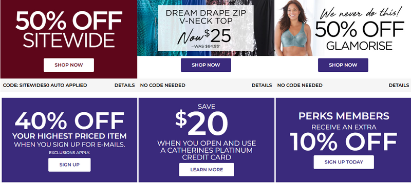 Yes. Catherines issues a 50% off $100 discount code during flash sales and special seasonal promotions. Based on shopper reports, it has a redemption success rate of approximately 70% across these events.