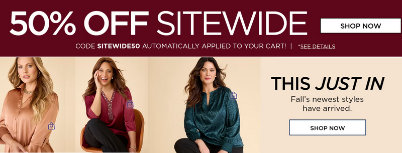 Sitewide 50% Off Event | 50% off entire purchase | Dresses, tops, jeans, intimates |