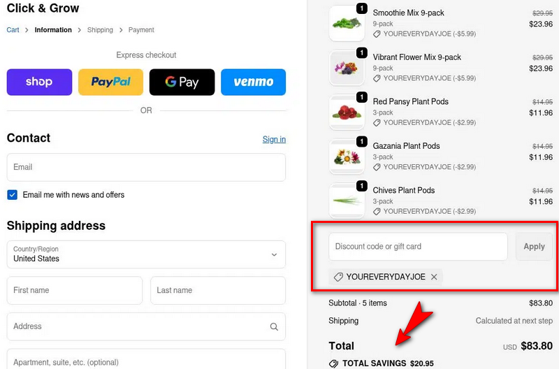 Using your savings is a simple three-step process. Follow these instructions to apply a Click and Grow coupon code at checkout.
