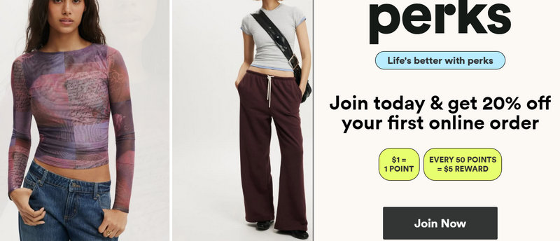 Cotton On heavily promotes the "Join Today & Get 20% Off" initiative for new Cotton On & Co. Perks members.