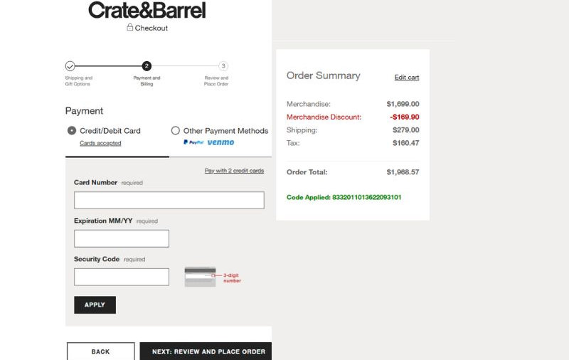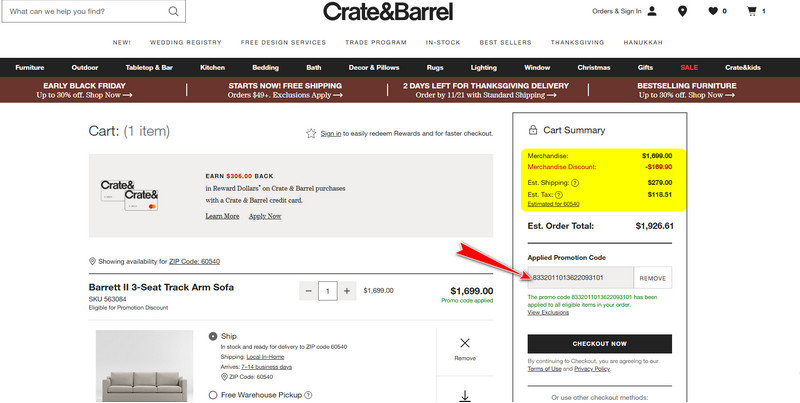 Applying a Crate and Barrel code is simple and quick. Here's how you can do it: