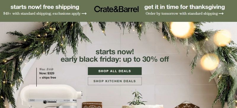 While sitewide free shipping codes are rare, Crate & Barrel offers free shipping on 2,000+ select items (usually smaller decor, tabletop, and bedding).