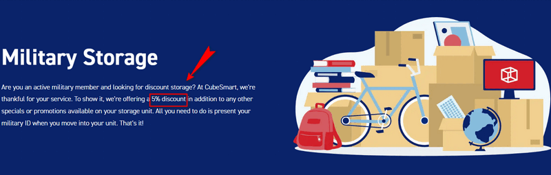As a thank you note for the active military members, CubeSmart does offer a CubeSmart military discount. In addition to any other deals or promotions on your storage unit, they are giving a 5% discount.