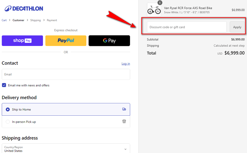 Step 4: On the checkout page, you‘ll see a field that says "Discount code or gift card". Enter the Decathlon discount code first order 10% off exactly as it appears.