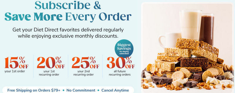 Important Note: Diet Direct coupons cannot be combined with automatic Subscribe & Save discounts. However, all subscription orders over $79 qualify for free standard shipping.