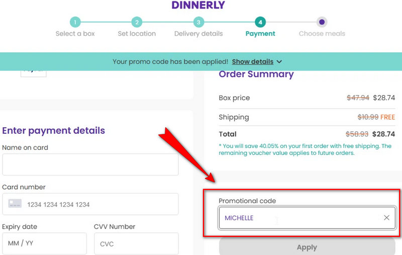 Step 3: On the shopping bag page, enter your Dinnerly $100 off voucher code for existing users into the Promotional code box.