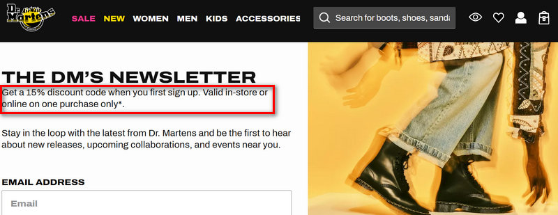 To receive a 15% discount, sign up for the official Dr. Martens UK newsletter at the bottom of their homepage. You will receive a unique, one-time-use code via email.