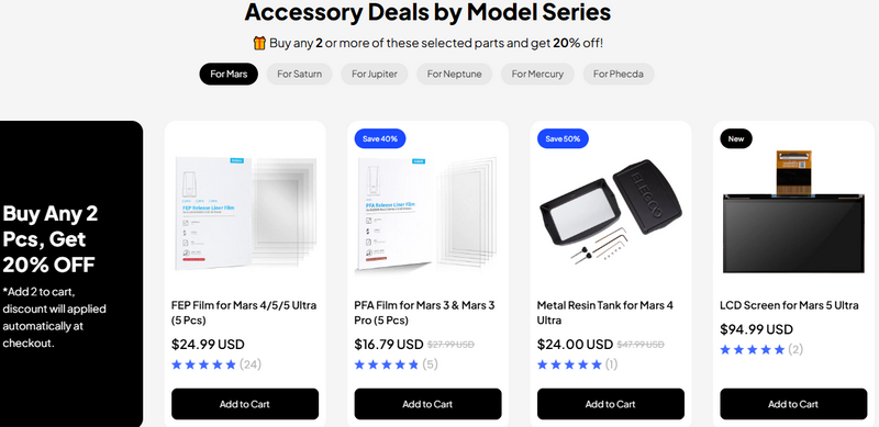 Excitingly, ELEGOO runs an accessories promotion: buy any 2 items and receive 20% off, perfect for spare parts or upgrade kits.
