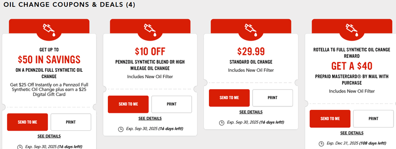 Generally, oil change coupons cannot be stacked with rebates. Customers pick either the $25 oil change coupon or seasonal gift card promos (e.g., $25 Pennzoil digital gift card), but not both on the same invoice.