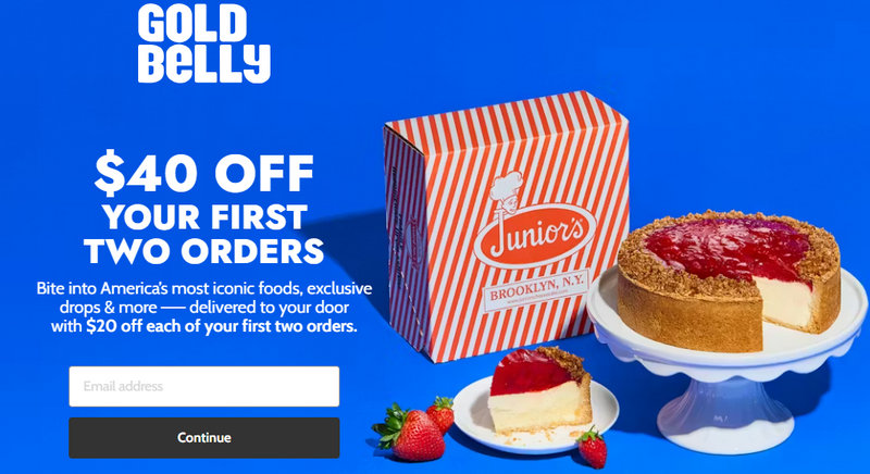 Yes. Receive Goldbelly $15 off first order, Goldbelly $20 off first order. When you sign up your email and texts!