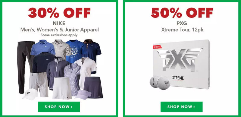 Anniversary/ Brand Spotlight Events | 10–25% off | Featured brands (e.g., TaylorMade, Callaway, Titleist) across clubs/apparel |