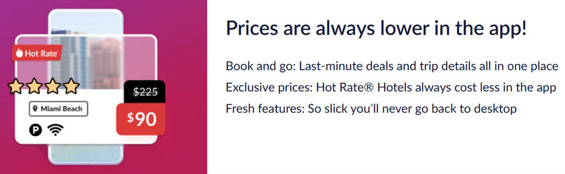 App-Only Discount | 10% Off select Hot Rate Hotels | Ongoing offers often appear as a banner within the app itself. Prices on Hot Rate Hotels are often lower in the app. |
