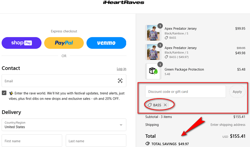 Step 4: On the checkout page, you will see a field that is labeled "Discount Code or Gift Card". Enter your iHeartRaves coupon code January 2026.