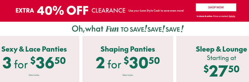 The most frequent, large-scale version of this promotion is Lane Style Cash. Shoppers earn a $25 Style Cash coupon for every $50 spent during the earn period. This coupon is then redeemed as $25 off a qualifying $50 purchase during the subsequent redemption window. The $25 off $75 structure is also periodically offered as a targeted reward or gift cheque.