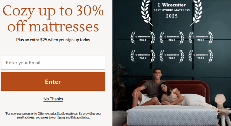 WELCOME25 | $25 off mattresses | 89% | Ongoing |