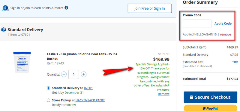 Leslie’s Pool | Chlorine tablets, shock, water testing supplies, filters, cleaners, equipment parts | HELLOAGAIN15 |