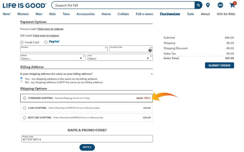Opt for the payment options Life Is Good offers. Continue to look for the "Promo Code" box and add your saved code there. Click "Apply" and see the discount reflected.