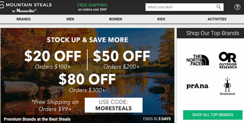 Orders of $99 or more receive Mountain Steals free shipping, while orders of less than $99 are charged a flat rate of $4.95.