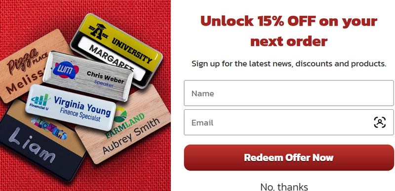 Email Subscriber Deal | 15% Off First Order | New customers, all custom badge designs | WELCOME2501 |
