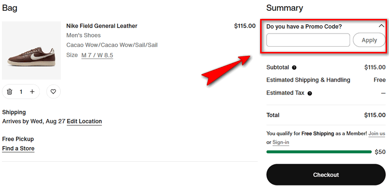 Occasionally, Nike offers 20% off generator promo codes valid for discounts on Nike.com and in the Nike App. If you have a valid promo code, you can apply it either in your bag or at checkout.