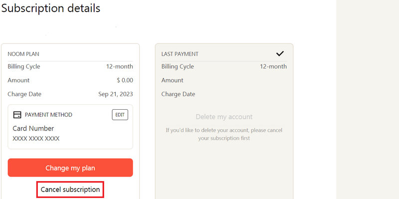 Log into your Noom Subscription Portal with the same credentials you used to create your account. Once you log into the Subscription Portal, you’ll see an option to cancel right on the main page: