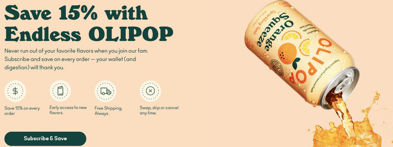 The Olipop subscription program, branded as "Soda on Tap", offers the best perpetual savings and convenience for regular buyers.