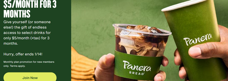 Panera Sip Club 2 months free promotion excludes all other beverages, including, without limitation, packaged beverages, smoothies, frozen blended drinks, hot chocolate, cold brew iced coffee, and espresso and cappuccino beverages. Customizations, including, without limitation, added espresso and syrups (e.g., vanilla, chocolate, cinnamon, and caramel) are not included in the subscription monthly price. Upcharges apply. Other additions (e.g., milk, skim milk, almond milk, half & half, and sweeteners) are included in the monthly subscription price, but availability may vary by location and time of day. Limit one subscription per person. Excludes catering orders and orders placed on third-party delivery sites.