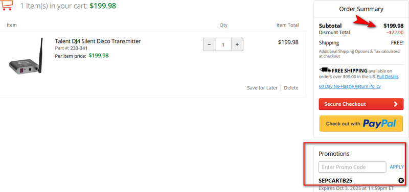 The best approach is to check the “On Sale” or “Special Buys” section and the email newsletter. Parts Express often sends 25%-off codes for specific categories or minimum spend thresholds.