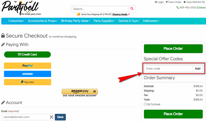 Applying a PartyBell.com free shipping code or a verified PartyBell coupon code 2026 is simple. Follow the steps below to unlock instant savings on costumes, party décor, and supplies: