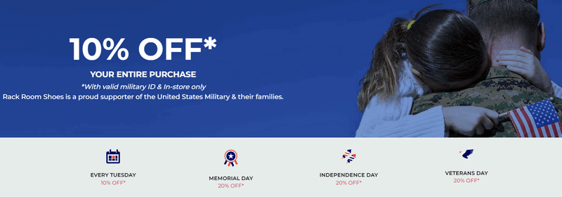 Absolutely! Rack Room Shoes provides a 10% discount every Tuesday in-store for U.S. military members and their families with valid ID. Even better, on Memorial Day, Independence Day, and Veterans Day, the discount increases to 20% off eligible purchases, making it a great way to save year-round.
