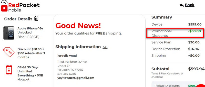 Red Pocket Mobile offers free shipping on orders over $50. Most plans and SIM cards qualify for this offer, with items typically arriving within 3 to 5 business days.