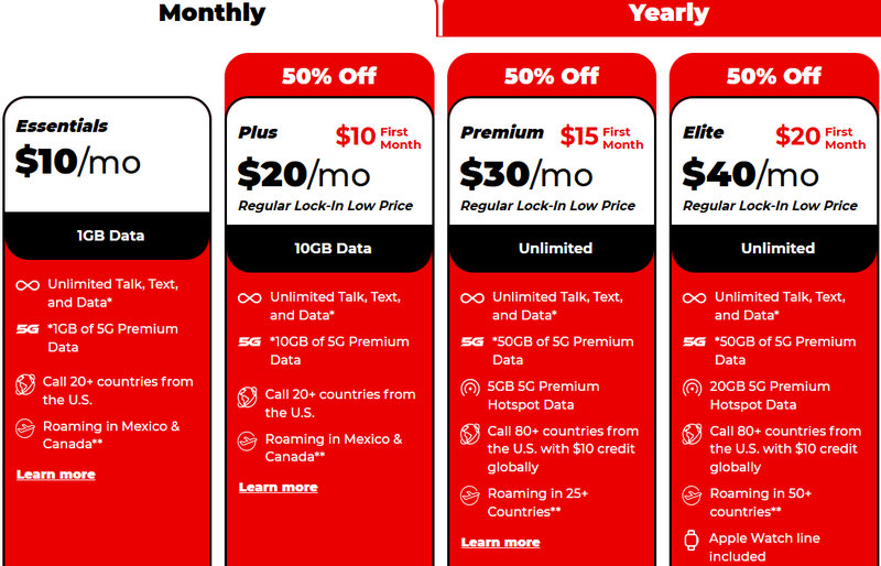 3–12-month prepaid plans, 5–Unlimited GB, eSIM/BYOD. | Intro plan promo (3-month intro pricing; code-free). | |
