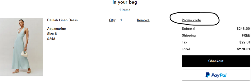 Step 3: You can enter your Reformation promo code first order on either the View Bag page before checkout or on the Payment Page at checkout.
