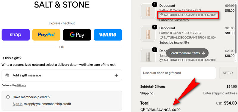 Use the loyalty discount (when eligible), aim for bundle/set value, and meet free shipping minimums—especially when shopping best sellers like deodorant and body wash.