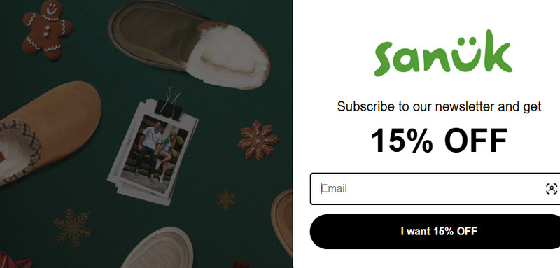 Signing up for Sanuk's newsletter is easy! Scroll to the bottom of their homepage and look for the newsletter sign-up field. Enter your email, click subscribe, and you're in! As a welcome gift, you'll get a 15% off coupon for your first order.