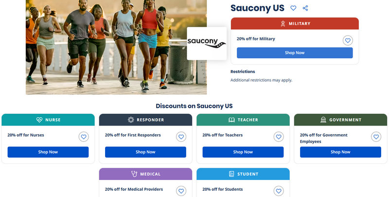 The Saucony military discount of up to 20% is available to active duty personnel, veterans, retirees, National Guard, Reservists, and Military spouses & dependents. Verification is required through the ID.me portal during checkout. Saucony also offers community discounts for students, teachers, and first responders.