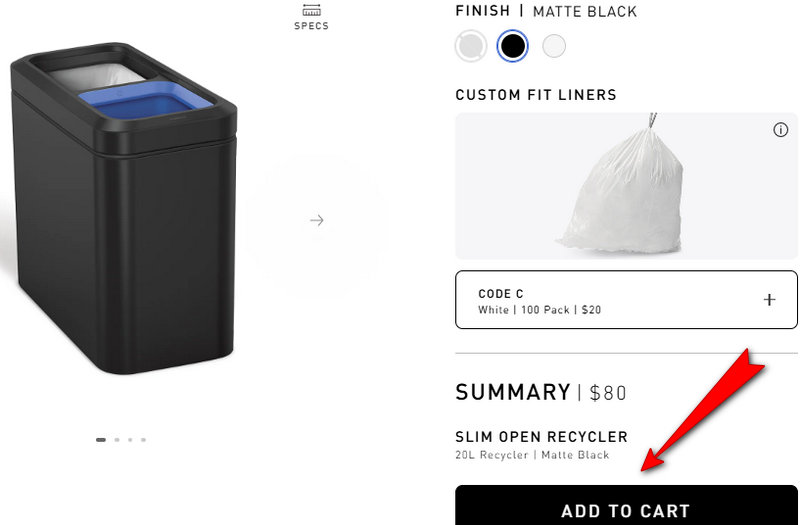 - Step 2: Add items to your cart — for example, a sensor trash can, custom fit liners, and a soap dispenser.